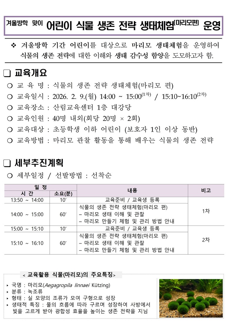 이번 프로그램은 추운 날씨로 야외 활동이 줄어든 어린이들에게 실내 관찰과 체험이 용이한 마리모를 활용해, 식물이 환경에 적응하고 살아가는 방식을 직접 경험할 수 있도록 기획된 체험형 프로그램이다.