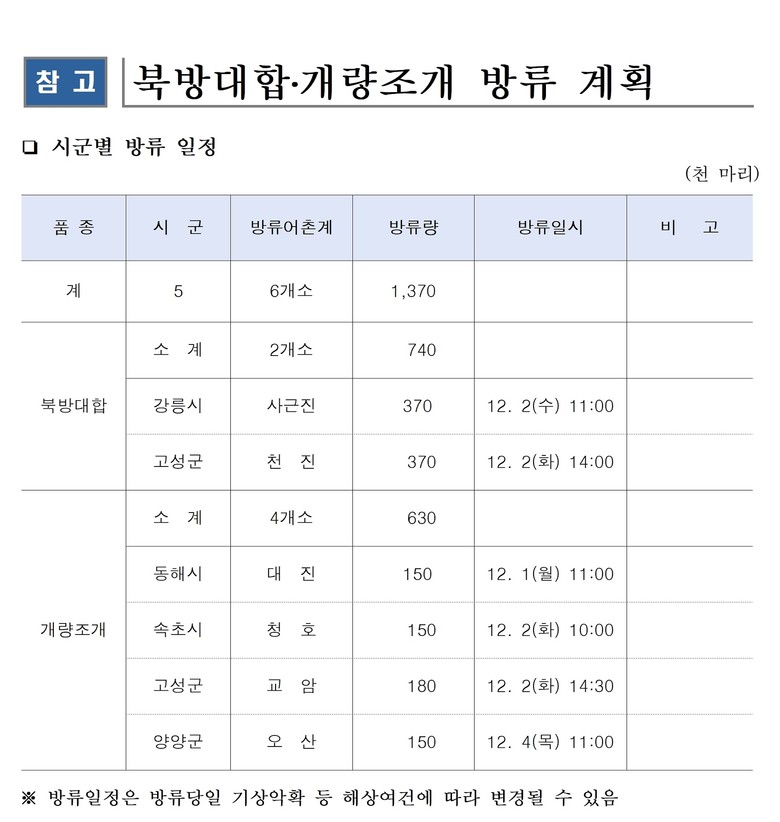 [강원도 세계타임즈=김민석 기자] 강원특별자치도(도지사 김진태)는 12월 1일부터 4일까지 도내 5개 시군(강릉·동해·속초·고성·양양) 6개 어촌마을 해역에 북방대합 74만 마리와 개량조개 63만 마리 등 총 137만 마리를 무상 방류한다고 밝혔다.