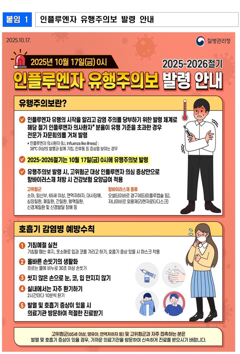 정영미 강원특별자치도 복지보건국장은 “올겨울 인플루엔자 확산 시기가 전년보다 앞당겨진 만큼, 어린이·임신부·어르신 등 고위험군은 감염 예방의 가장 효과적인 방법인 예방접종을 가능한 한 조속히 받아주시길 권고드린다”고 강조했다.