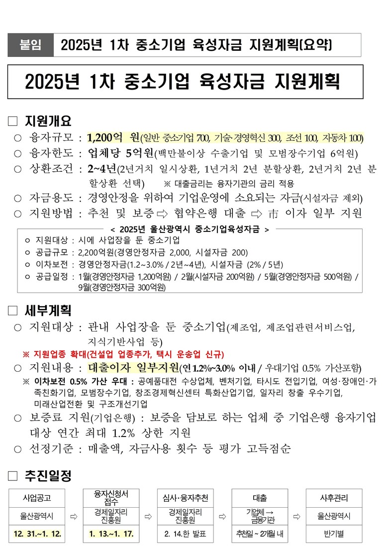 육성자금 지원에 대한 상세한 설명과 신청 서류는 울산시 누리집(www.ulsan.go.kr)의 ‘2025년 울산광역시 1차 중소기업 육성자금 지원계획’ 공고를 통해 확인할 수 있다.
