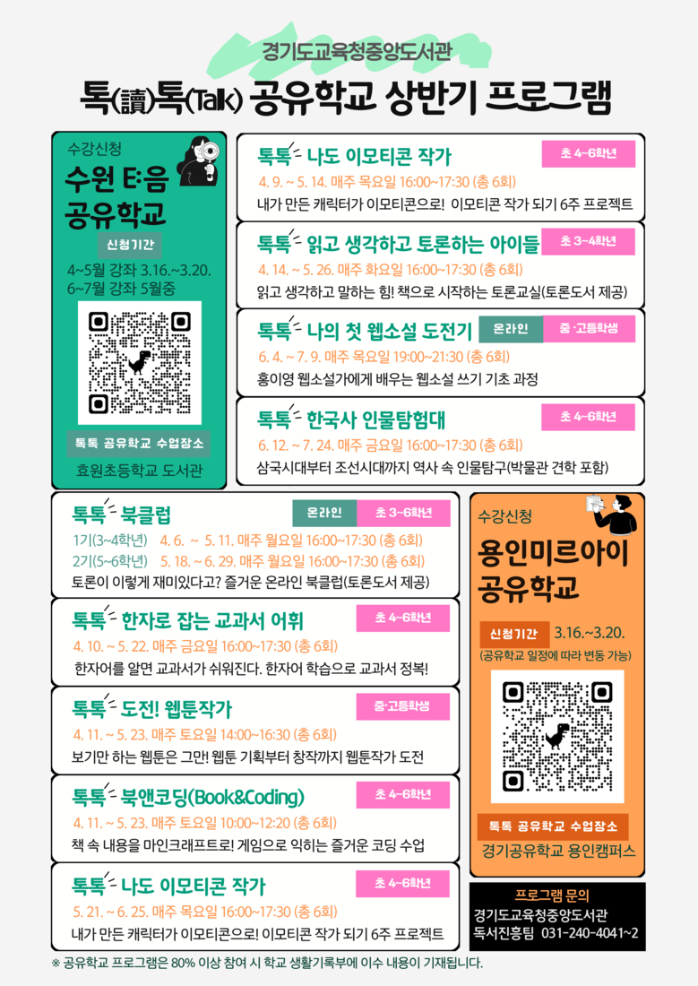 수원 지역에서는 ▲주제별 심층 독서와 토론으로 사고를 확장하는 ‘읽고 생각하고 토론하는 아이들’▲현직 웹소설가와 함께 웹소설 창작 과정을 배우는 ‘나의 첫 웹소설 도전기’▲디지털 드로잉을 활용해 이모티콘을 제작하고 실제 플랫폼 제안까지 경험하는 ‘나도 이모티콘 작가’▲역사 속 인물을 중심으로 한국사를 탐구하는 ‘한국사 인물탐험대’가 운영된다.
