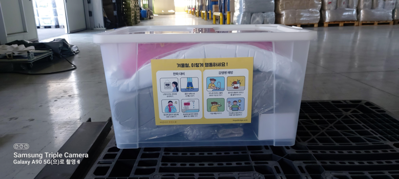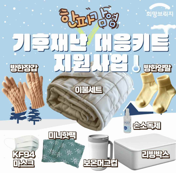 구호품은 이불패드, 방한장갑, 방한양말, 소형손난로(미니핫팩), 보온머그컵, 마스크, 손소독제 등 필수 용품들로 구성됐다.