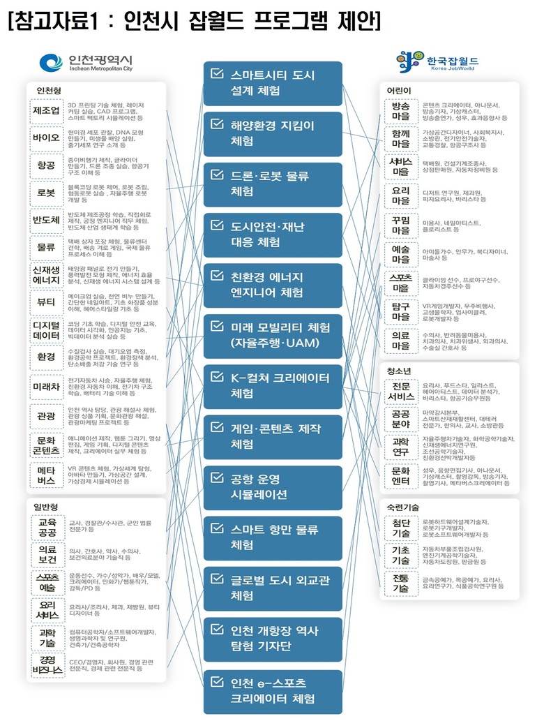 이에 연구원은 인천의 전략 산업과 연계한 ‘인천형 특화 잡월드(아이잡월드)’ 건립을 제안했다. 이는 송도(바이오), 영종(항공·물류), 청라(로봇·금융) 등 지역 산업 특성을 반영한 프로그램을 통해 ‘인천에서 배우고 인천에서 일하는’ 선순환 체계를 구축하고, 산업과 인재 간의 미스매치를 해소하기 위함이다.