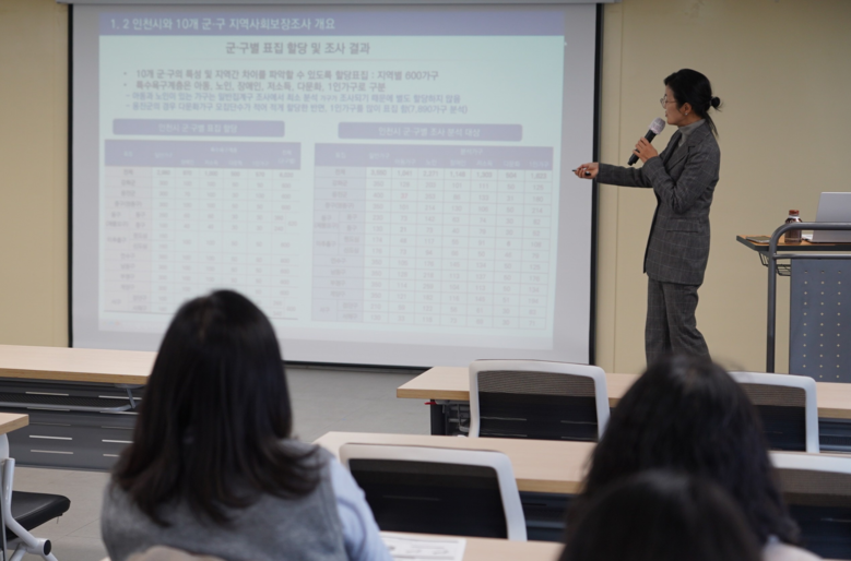 | ▲ 이선정 인천시사회서비스원 정책연구실 연구위원이 지난 3일 인천사서원 대회의실에서 인천시 지역사회보장조사 중간 보고를 하고 있다. |