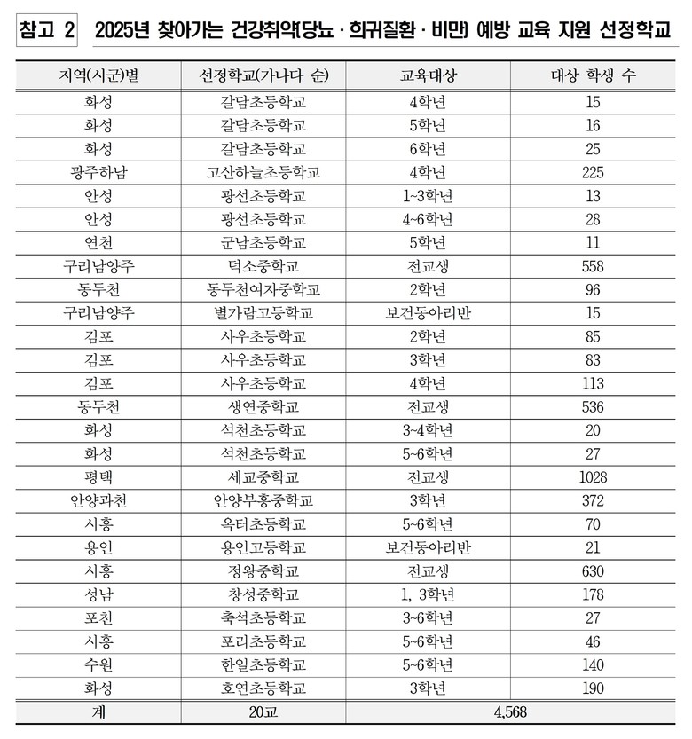 [경기도 세계타임즈=송민수 기자] 경기도교육청(교육감 임태희)은 학생의 자기 건강관리 역량 함양과 학교 구성원의 인식개선을 위해 ‘학교로 찾아가는 건강 취약(당뇨·희귀 질환·비만) 예방 교육’을 운영한다.