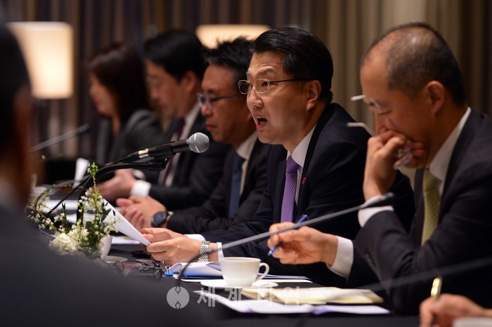 진웅섭(오른쪽 두번째) 금융감독원장이 24일 오전 서울 여의도 콘래드호텔에서 열린 외국계 금융회사(금융투자회사) CEO 조찬간담회에서 모두발언을 하고 있다. 이번 간담회에 참석자들은 재산상 이익 제공 관련 규제완화, 외국계 금융회사에 대한 최다 출자자 적격성 심사 완화 등과 애로 및 건의사항을 청취하고 올해 대내외 주요 리스크 요인 및 전망에 대해 토론했다. 2017.01.24.