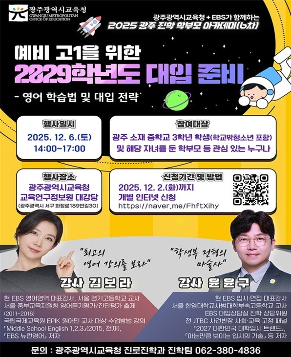 아카데미 참여를 희망하는 학생과 학부모는 오는 2일까지 광주진로진학지원센터 누리집을 통해 신청하면 된다. 당일 현장 접수도 가능하다. 특강은 행사가 끝난 후 EBSi 홈페이지에 탑재된다.