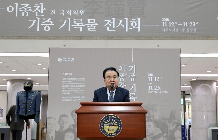이 자리에서 문 의장은 “오늘은 존경하는 이종찬 전 국회의원님께서 기증해주신 기록물을 전시하는 자리이자, 6,500여 점의 방대한 정치인생의 기록물이다”라며 “이는 한국 정치의 거목이자 산 증인의 치열했던 삶과 역사다. 가슴 깊이 우러나오는 깊은 존경과 감사의 말씀을 드린다”고 이종찬 전 의원의 기증에 대해 감사의 인사를 표했다.