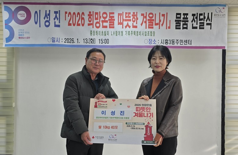 이어 시흥3동 중앙하이츠빌라 가로주택정비사업조합장 이성진 씨도 ‘2026 희망온돌 따뜻한 겨울나기’ 사업에 동참했다. 이 조합장은 지난 13일 시흥3동 주민센터에 저소득 주민들을 위해 쌀 10kg 40포를 기탁했다. 지난해에도 쌀 400kg을 후원하는 등 지속적인 나눔을 실천해 오고 있다.