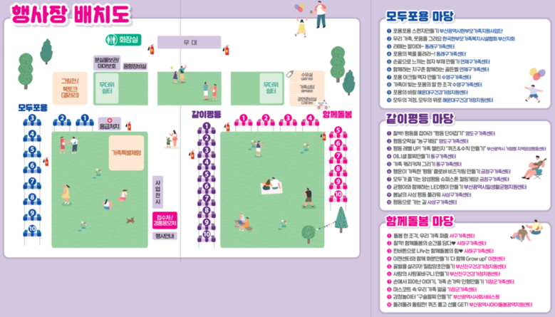 시가 주최하고 부산광역시건강가정지원센터와 구·군 12개 건강가정 및 가족센터가 주관하며, 부산의 가족 1만여 명이 참여할 예정이다.