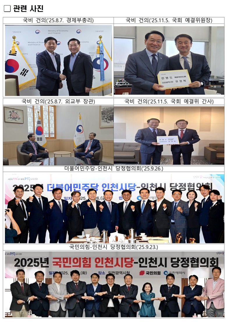 유정복 시장은 정부 예산 편성이 본격화되는 5월부터 12월까지 기획재정부와 중앙부처, 국회 예결위원회 및 상임위원회 주요 인사들과 수시로 면담하며 인천 현안 사업의 필요성을 적극 설명하고 설득하는 등 국비 확보를 위해 다각적인 노력을 기울였다.