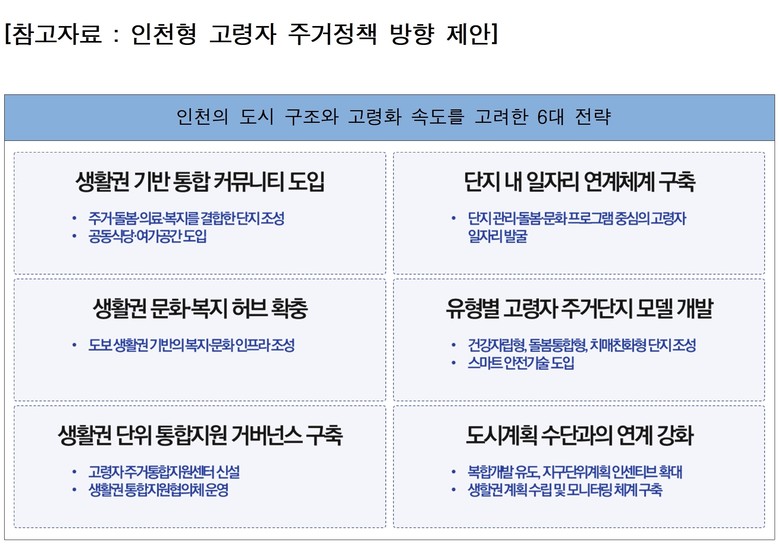 인천연구원은 인천의 도시 구조와 빠른 고령화 속도를 고려해 생활권 기반 통합 커뮤니티 도입, 단지 내 고령자 일자리 연계, 생활권 문화·복지 허브 확충, 유형별 고령자 주거단지 모델 개발, 생활권 단위 통합지원 거버넌스 구축, 도시계획 수단과의 연계 강화 등 여섯 가지 전략을 제안했다.