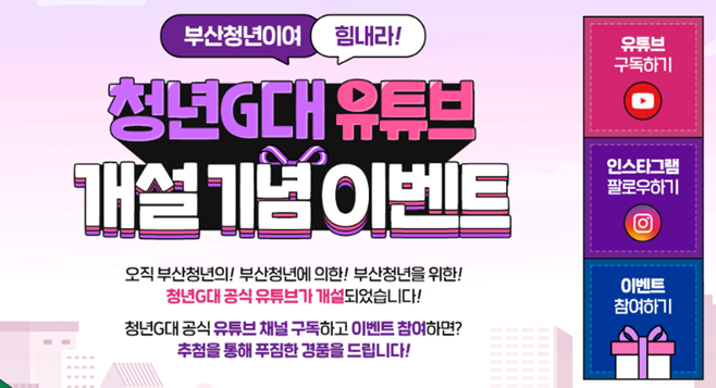이번 행사(이벤트)는 지난 7월부터 선보인 청년지(G)대 유튜브 채널 개설을 기념하여, 부산청년의 목소리를 적극적으로 담아내고 부산청년과 직접 소통하기 위해 마련되었다.