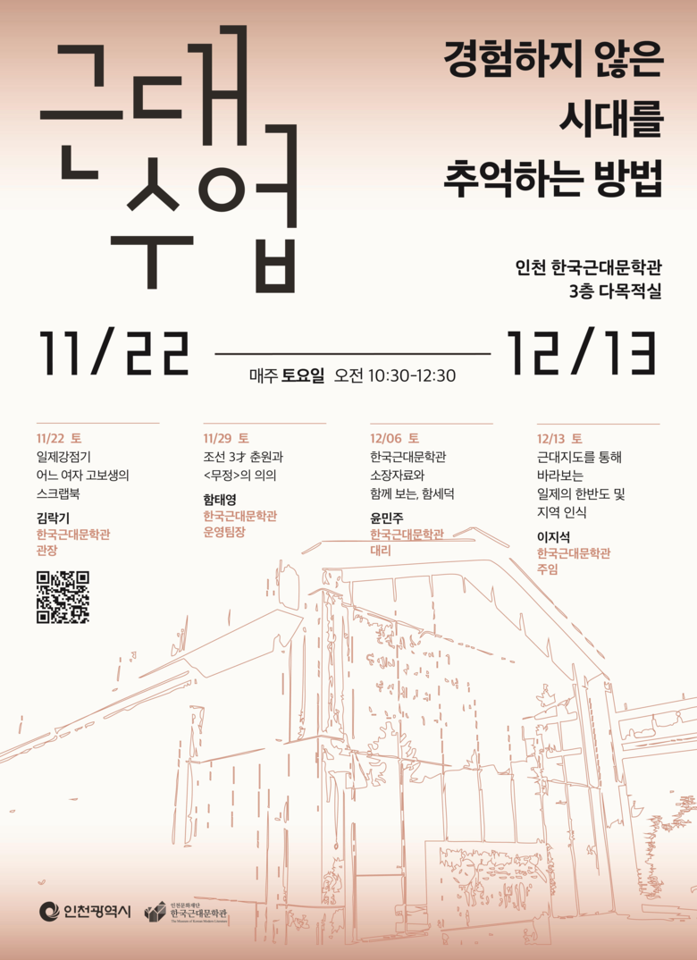 [인천 세계타임즈=심하린 기자] 인천문화재단 한국근대문학관이 2025년 11월 22일(토)부터 총 4회에 걸쳐, 매주 토요일 <근대수업 – 경험하지 않은 시대를 추억하는 방법> 강좌를 진행한다.