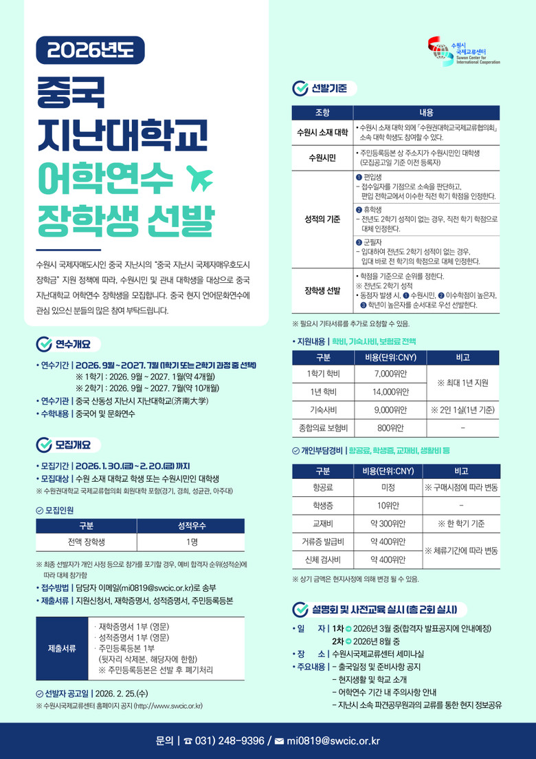 이번 프로그램은 자매도시인 중국 지난시의 국제 자매·우호도시 장학생 선발 요청에 따라 추진하는 사업이다. 수원시민과 관내 대학생에게 해외 어학연수 기회를 제공하고 글로벌 역량을 갖춘 지역 인재를 양성하기 위해 마련했다.