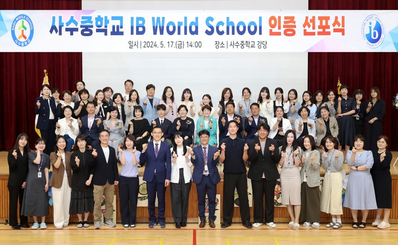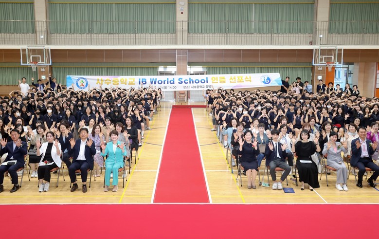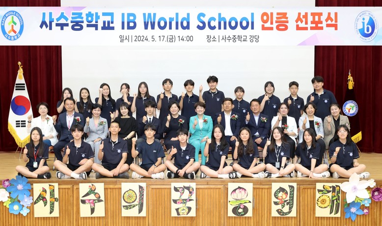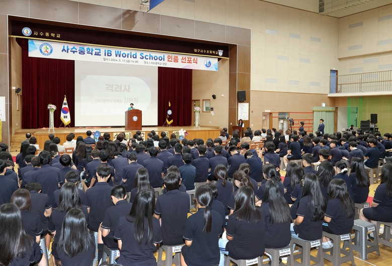 [대구 세계타임즈=한윤석 기자] 사수중학교(교장 김미리)는 IB MYP(국제 바칼로레아 중학교 프로그램) 과정 IB 월드스쿨로 공식 인증을 받아, 5월 17일(금) 강은희 대구시교육감 등 50여 명의 내·외빈을 초청한 가운데 IB 월드스쿨 인증 선포식 및 수업 참관 행사를 실시했다.