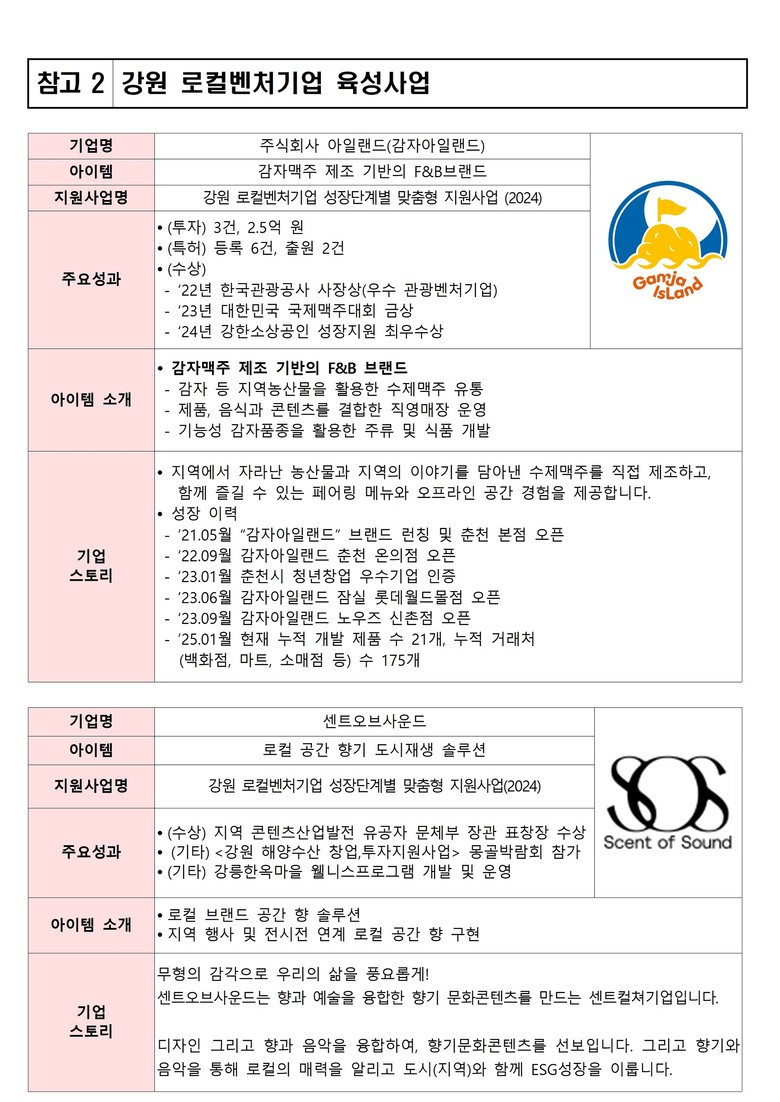 대표적인 우수 사례로는 감자 맥주 제조 기반의 F&B 브랜드 ‘주식회사 아일랜드(감자아일랜드)’와 고유한 지역의 가치를 향기로 표현하는 ‘센트오브사운드’가 있다.