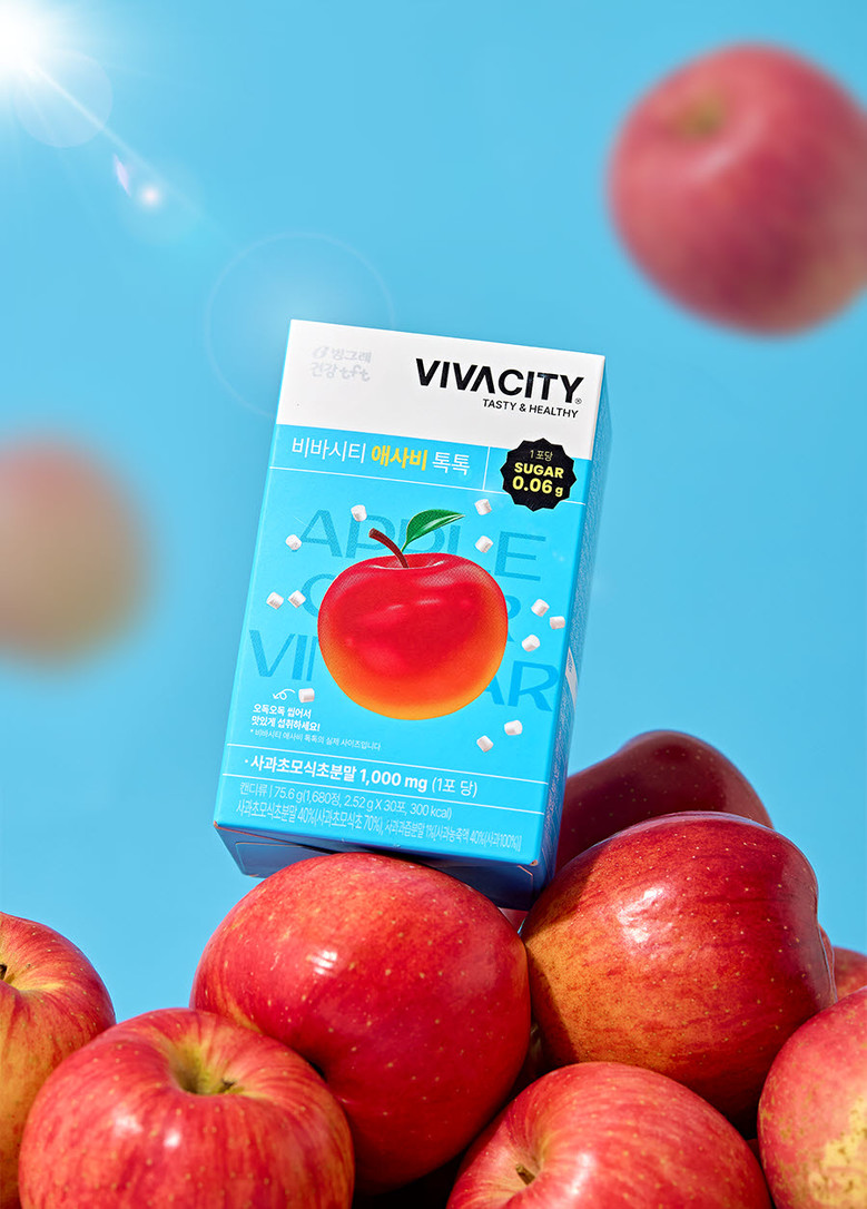 비바시티 애사비 톡톡은 빙그레의 건강지향 브랜드 ‘빙그레 건강tft’가 새롭게 선보이는 씹어 먹는 정제형 애사비 제품이다. 애사비는 애플사이다비니거의 줄임말로 최근 미국, 유럽 등 해외에서 유행하며 인기가 급증했다. 빙그레는 식초 특유의 쿰쿰한 맛을 섭취하기 어려운 소비자를 위해 애사비를 소형 정제에 압축하여 맛있고 간편하게 섭취할 수 있는 신제품을 출시했다.