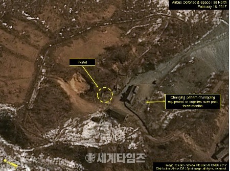 '38노스'가 24일(현지시간) 공개한 북한 함경북도 풍계리 핵실험장 북쪽 갱도의 입구 모습. (사진출처: 38노스) 2017.02.25.