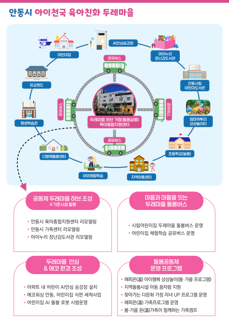 안동시는 기존 육아 기반시설을 집적.연결하는 허브 조성을 핵심 전략으로 한다. 육아종합지원센터를 리모델링해 돌봄 살롱과 종합 안내 기능을 강화하고, 가족센터.장난감도서관과 연계해 부모 상담, 놀이·교육, 공동체 활동이 한 공간, 한 동선에서 이뤄지도록 설계한다. 특히‘마을과 마을을 잇는 돌봄버스’운영으로 등·하원, 방과 후 돌봄, 체험 이동까지 지원해 돌봄 접근성을 높이고, 어린이 안심 승강장과 식판 세척 사업을 통해 아동 안전과 지역 일자리를 동시에 확보한다. 또한 AI 돌봄 로봇 시범 운영으로 미래형 보육환경을 구축한다.