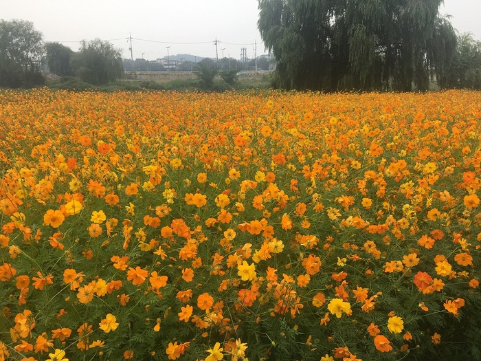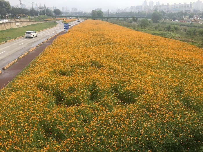 [대전=세계타임즈 이장성 기자] 전형적인 가을 날씨를 보인 대전천변에 대전시 하천관리사업소에서 재배한황화코스모스가 활짝 피어 가을의 정취를 물씬 풍기고 있다.