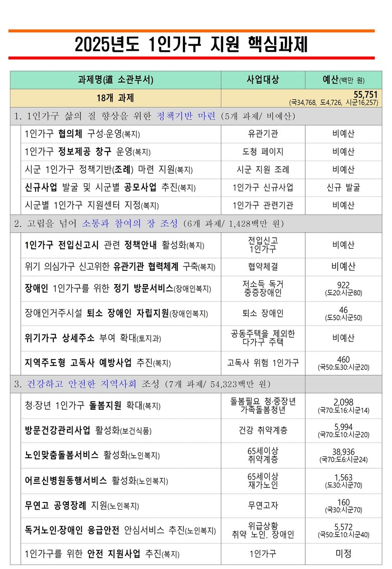 올해는 총 18개 과제, 557억 원 규모의 ‘2025년 1인가구 지원 시행계획’을 마련하여, 보다 실효성 있는 지원책을 적극 추진할 계획이다.