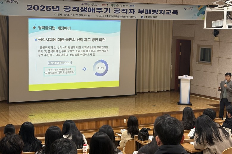 [광주 세계타임즈=손권일 기자] 광주시교육청(교육감 이정선)은 28일 광주시교육청교육연수원 시청각실에서 ‘공직생애주기 공직자 부패방지교육’을 실시했다.