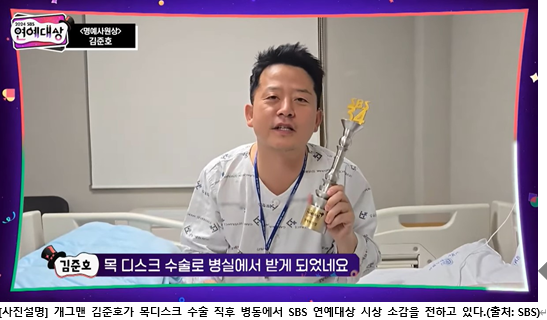 실제 올해 결혼을 앞둔 인기 개그맨 김준호도 최근 목디스크 수술을 받은 사실이 공개되기도 했다. 그는 해외 여행을 다니는 컨셉의 한 예능 프로그램에서 비좁은 이집트 피라미드 내부를 오르내리다 "목 디스크 때문에 더는 못 하겠다"며 고개를 떨구는 등 관련 통증을 지속 호소해 온 바 있다. 급기야 지난 1월 말에는 목디스크 수술로 '2024 SBS 연예대상 명예사원상' 수상 소감을 무대가 아닌 병실에서 전하기도 했다.