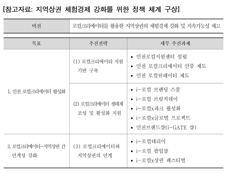 최근 중앙정부의 정책은 로컬크리에이터와 지역상권을 연계하는 방향으로 추진되고 있어, 인천 역시 이러한 흐름에 발맞추어 로컬크리에이터 관련 정책들의 연속성과 상권과의 연계성을 강화할 필요가 있다.