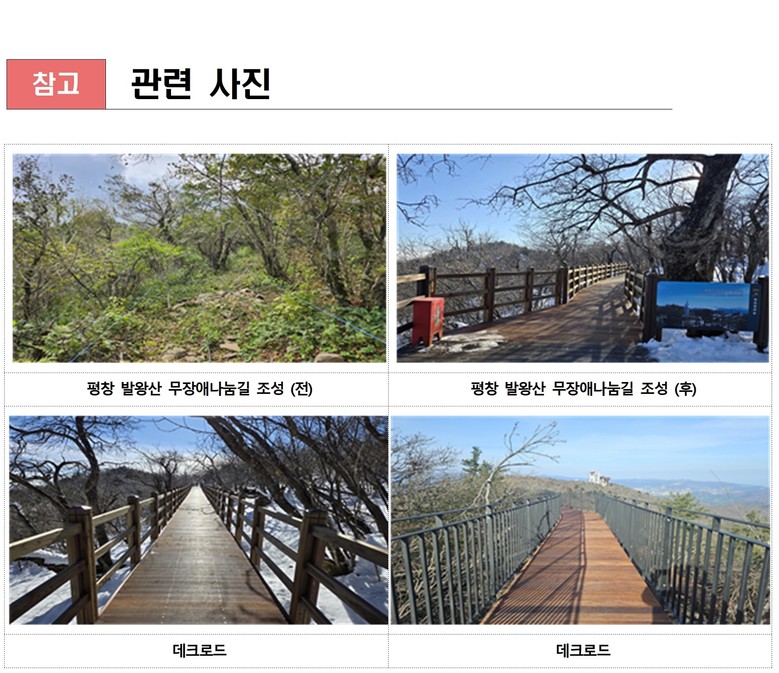 아울러, 강원자치도는 2016년부터 2024년까지 14개소, 15.1㎞의 무장애 나눔길을 조성했으며, 금년에도 평창 치유의숲 일원에 무장애 나눔길(1㎞, 약 8억 원)을 조성 중에 있다.