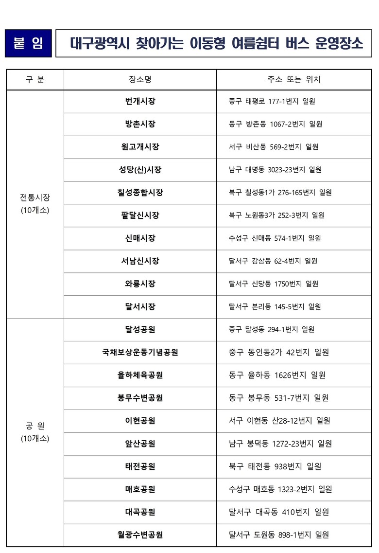전통시장 10곳, 공원 10곳 등 총 20곳에서 운영되며, 자세한 위치는 대구시 홈페이지 팝업창에서 확인할 수 있다. 운영 기간은 8월 17일(일)부터 9월 30일(화)까지, 시간은 오전 10시부터 오후 5시까지다.