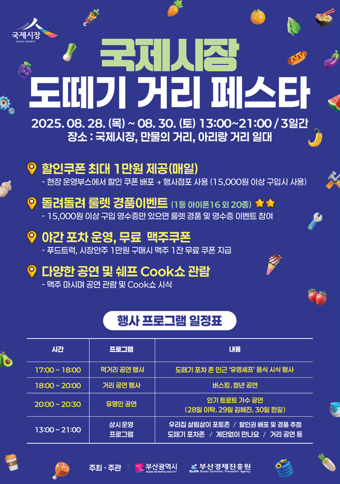 김봉철 시 디지털경제실장은 “국제시장은 오랜 세월 부산의 대표 상권이자 역사와 추억이 담긴 공간”이라며, “이번 행사를 통해 시장 상인들의 매출 증대와 소비를 촉진하고, 시민과 관광객에게 다양한 볼거리와 즐길 거리를 제공하겠다”라고 전했다.