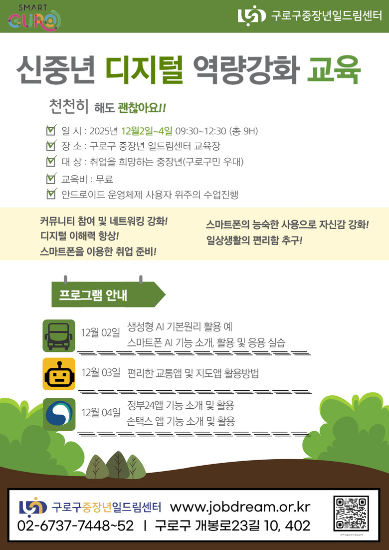 장인홍 구로구청장은 “이번 교육이 중장년층이 변화하는 사회 환경 속에서도 능동적으로 대응하고 새로운 진로를 탐색하는 데 큰 도움이 되길 바란다”며 “앞으로도 생애주기별 맞춤형 교육을 통해 모든 세대가 함께 성장하는 구로구를 만들어 가겠다”고 말했다.