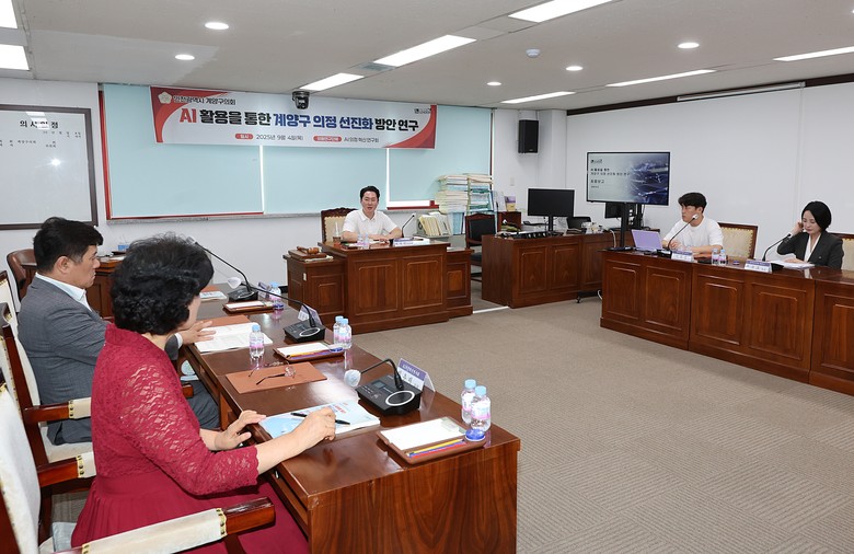 [계양구 세계타임즈=심하린 기자] 인천 계양구의회(의장 신정숙) 의원연구단체인 「AI의정혁신연구회」는 지난 4일 계양구의회 상임위원회실에서 「AI 활용을 통한 계양구 의정 선진화 방안 연구」 연구용역 최종보고회를 개최했다고 밝혔다.
