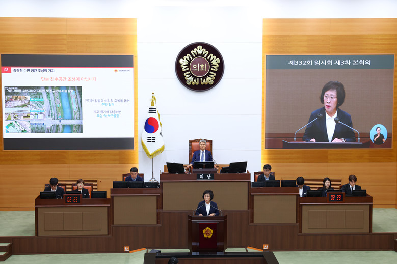 이어 신 의원은 “이처럼 중요한 계획의 변경이 주민들과의 협의나 설명회 한 차례 없이 일방적으로 추진된 것은 매우 심각한 문제”라며, “지역의 수변공간 조성은 주민들의 건강한 일상, 심리적 회복, 기후위기 대응을 위한 중요한 녹지 공간이며 모두의 쉼터로 기능할 수 있는 곳” 이라며 중랑천 수변공간 조성의 필요성을 강조했다.