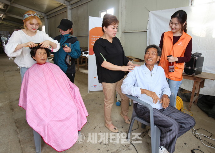 농번기인5월 어르신들이 맘 편히 미용, 건강 서비스를 받도록 하기 위해 한화생명 봉사단원 30여명도 함께했다.