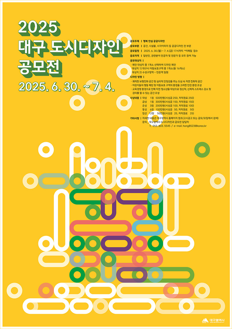 공공디자인에 관심 있는 일반인뿐만 아니라 관련 분야 전공자, 전문가도 참여할 수 있는 이번 공모전의 내용 및 기타 자세한 사항은 대구시 홈페이지(http://www.daegu.go.kr)의 고시공고 및 공모/모집에서 확인할 수 있다.