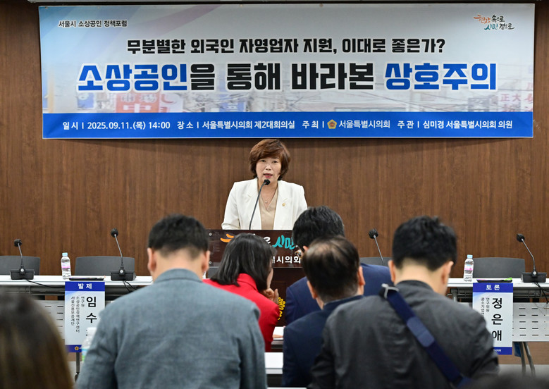 - “상생과 공존은 내외국인 모두 사회적 책임과 의무 안에서 조화 이루어야” [서울 세계타임즈=이장성 기자] 심미경 서울시의원(동대문2·국민의힘)이 지난 11일(목) '소상공인을 통해 바라본 상호주의' 토론회를 개최하였다. 이번 토론회는 서울시의 외국인 자영업자 지원 정책을 점검하고, 상호주의 원칙에 기반한 공정하고 균형 잡힌 정책방향을 모색하기 위해 마련되었다.