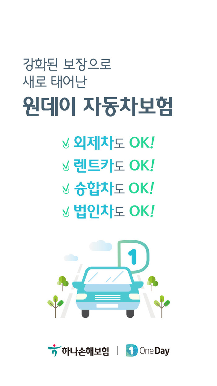 기존 원데이자동차Ⅰ,Ⅱ를 원데이자동차보험으로 통합하여 신설하였고 승용차로 한정되었던 가입 차종을 업계 최초로 외제차, 승합차, 화물차(1톤이하), 장기렌터카(1년이상 대여)로 확대하였다.