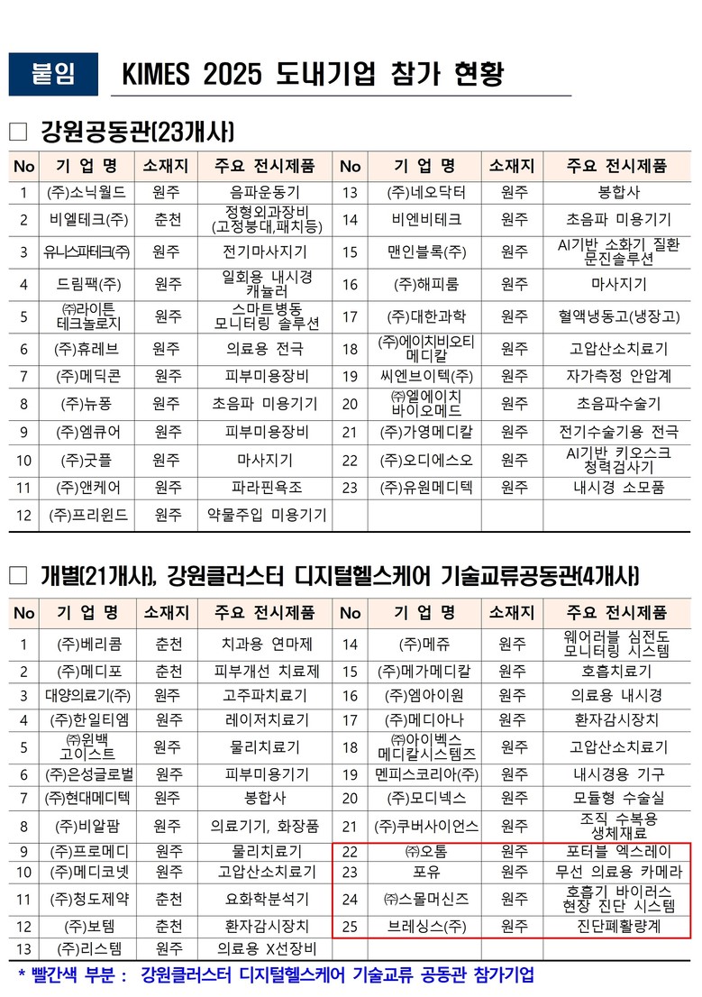 [강원도 세계타임즈=김민석 기자] 강원특별자치도(도지사 김진태)가 국내 최대 의료기기 전시회인 ‘KIMES 2025(국제의료기기병원설비전시회)’에 참가해 강원 의료기기 산업의 경쟁력을 선보인다. 도는 원주시와 협력해 도내 23개 기업을 선정하고, 강원공동관을 구성해 글로벌 시장 진출을 적극적으로 확대한다는 계획이다.