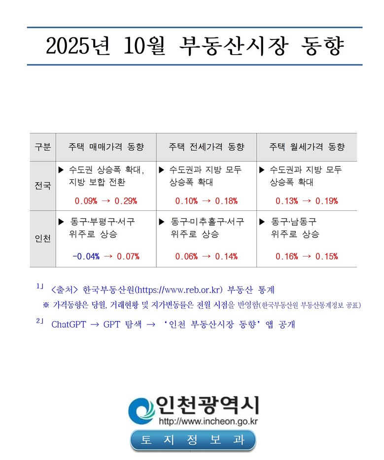 한편, 인천시는 시민들이 인천 부동산 시장 동향을 보다 쉽고 편리하게 파악할 수 있도록 ‘ChatGPT’의 ‘인천 부동산시장 동향’ 앱을 통해 지역별 주택 매매‧전월세 가격 변동률, 거래량, 아파트 매매‧전월세‧분양‧입주권 실거래가 등을 실시간 맞춤형 대화로 제공하고 있다.