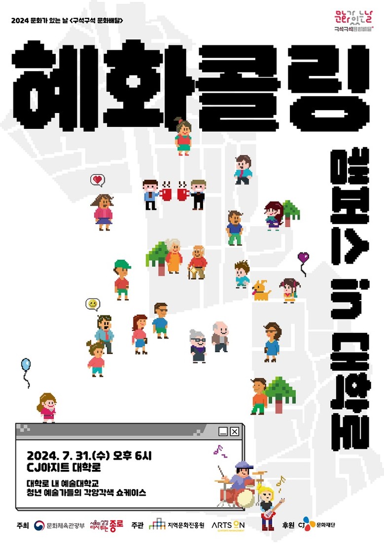 [㈜아츠온=세계타임즈 이상호 기자] 문화체육관광부와 종로구가 주최하고 지역문화진흥원, ㈜아츠온 이 주관하는 <2024 문화가 있는 날 구석구석 문화배달 “혜화콜링”/이하 구석구석 문화배달 “혜화콜링”>이 오는 7월 프로그램으로 CJ아지트 대학로에서 ‘캠퍼스 in 대학로’를 선보인다.