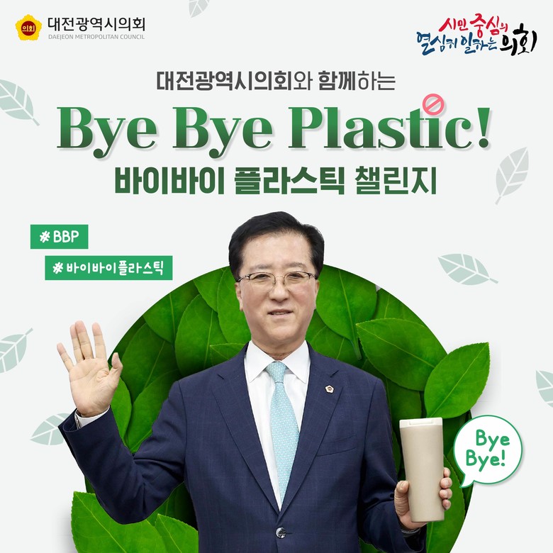 [대전 세계타임즈=이채봉 기자] 대전시의회는 21일, 조원휘 의장이 플라스틱 사용 저감을 위한 범국민 실천 운동 ‘바이바이(ByeBye) 플라스틱 챌린지’에 동참했다고 밝혔다.