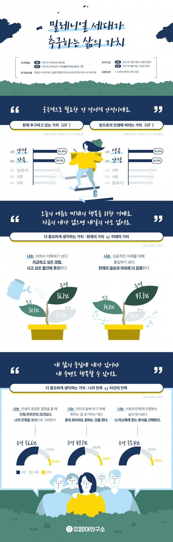 이 보고서에서는 밀레니얼 세대가 지향하는 삶의 방식과 가치관 및 영향을 미친 요인, 행복한 삶의 구체적인 모습과 필요한 조건 등을 집중적으로 분석했다.