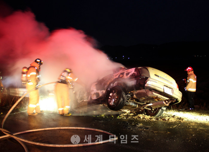 4일 오전 6시40분께 전북 군산시 개정면 한 논에서 불에 탄 그렌저 승용차가 발견돼 소방대원들이 진화작업을 벌이고 있다. 이 차량 안에서는 중년 여성의 시신도 함께 발견됐다. 2017.01.04. (사진= 전북소방본부 제공)