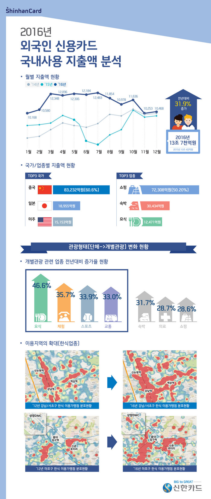 신한카드 빅데이터 분석 결과 ’16년 외국인 신용카드 지출액은 총 13조 7,400억원으로 전년 10조 4,152억원 대비 31.9% 증가한 것으로 나타났다. 최근 5년간 국내에서 외국인이 신용카드를 이용하여 소비한 금액은 매년 꾸준히 증가하여 약 2.2배 (12년 6조 3,350억원 대비)로 급증한 것으로 분석됐다.
