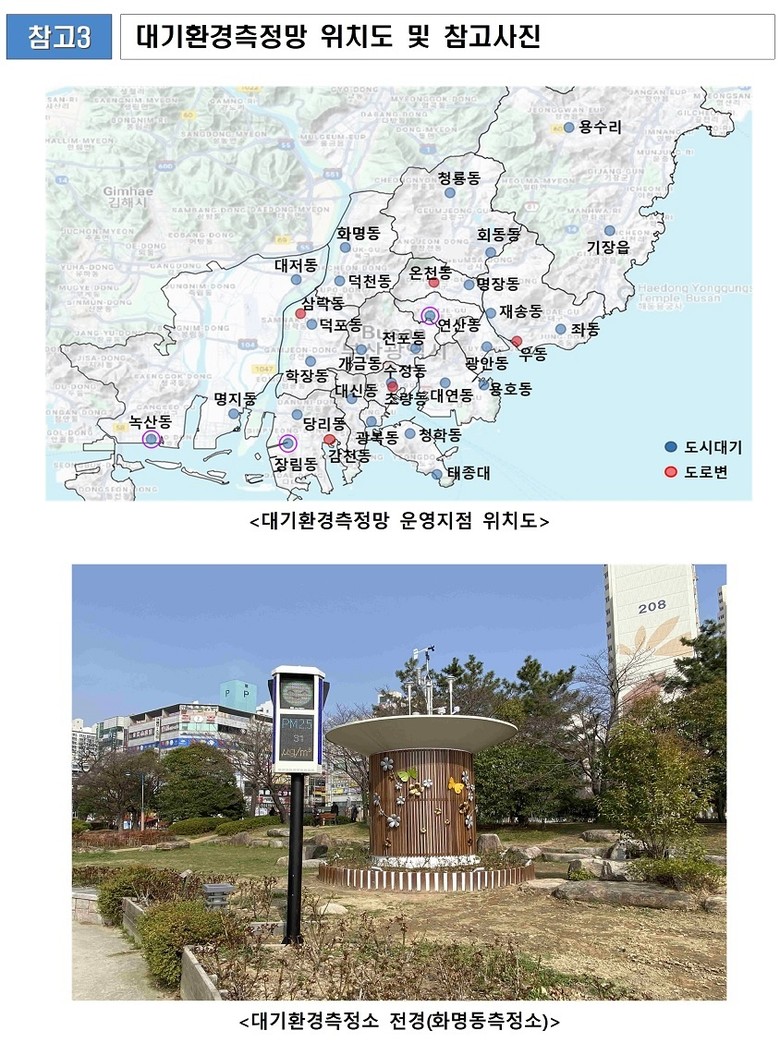 연구원은 대기질 모니터링 및 개선을 위해 부산 시내에 대기환경 측정소 32개(도시대기 27개, 도로변대기 5개)를 운영하고 있으며, 이번 조사에서 대기환경기준 6개 항목(미세먼지, 초미세먼지, 오존, 아황산가스, 일산화탄소, 이산화질소)을 측정하였다.