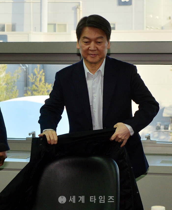 국민의당 안철수 전 공동대표가 24일 오전 광주 북구 한국광기술원 2층 대회의실에서 열린 '광융합산업 발전을 위한 기업간담회'에 참석해 옷을 벗어 의자에 걸고 있다. 2017.01.24.