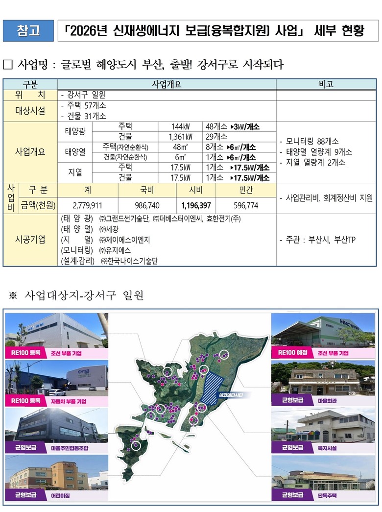 [부산 세계타임즈=이용우 기자] 부산시(시장 박형준)는 기후에너지환경부(한국에너지공단)의 「2026년 신재생에너지 보급(융복합지원)」 공모사업에 선정돼 강서구 일원에 태양광·태양열·지열 등 '신재생에너지 보급을 통한 전기요금 절감 및 알이(RE)100* 이행지원'을 본격 추진한다고 밝혔다.