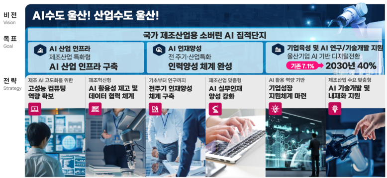 김두겸 시장은 “울산은 제조산업 기반 위에 데이터 인프라를 더해 인공지능(AI) 기반 산업 대전환의 중심에 설 수 있는 최적지”라며 “인공지능(AI) 기술을 주력산업에 접목해 실질적 성과를 창출하고, 제조 인공지능(AI) 분야에서 국가적 역할을 수행하겠다”라고 말했다.